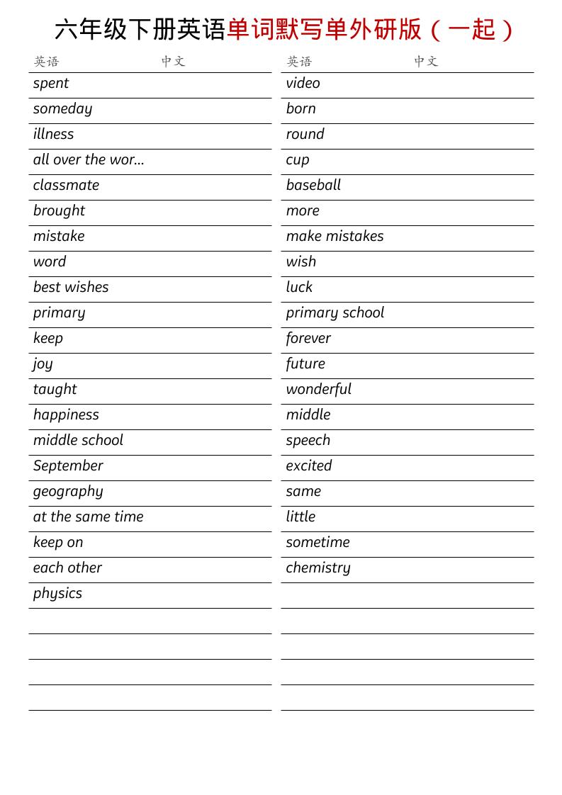 六年级下英语全册单词默写单《外研版(一起)》金榜学科4小时前更新关注私信86752六年级下英语全册单词默写单《外研版(一起)》此内容为付费阅读,请付费后查看金币9.9会员免费立即购买您当前未登录!建议登陆后购买,可保存购买订单付费阅读已售 5 ——预览已结束,还剩2页未读——您已获得此文档下载权限,请点击底部下载完整文档 课程下载: 此处内容已隐藏,请付费后查看 ------本页内容已结束,喜欢请分享------感谢您的来访,获取更多精彩文章请收藏本站。 © 版权声明1、本内容整理转载于公开网络,版权归原作者所有! 2、本站仅提供信息存储空间服务,不拥有所有权,不承担相关法律责任。 3、本内容若侵犯到你的版权利益,请网站首页底部联系我们,会尽快给予删除处理! 4、本站全资源仅供测试和学习,请勿用于非法操作,一切后果与本站无关。 5、如遇到充值付费环节课程或软件 请马上删除退出 涉及自身权益/利益 需要投资的一律不要相信,访客发现请向客服举报。 6、本教程仅供分享 请勿用于非法违规操作 否则和作者 官网 无关THE END会员免费 喜欢就支持一下吧点赞52 分享QQ空间微博QQ好友海报分享复制链接收藏